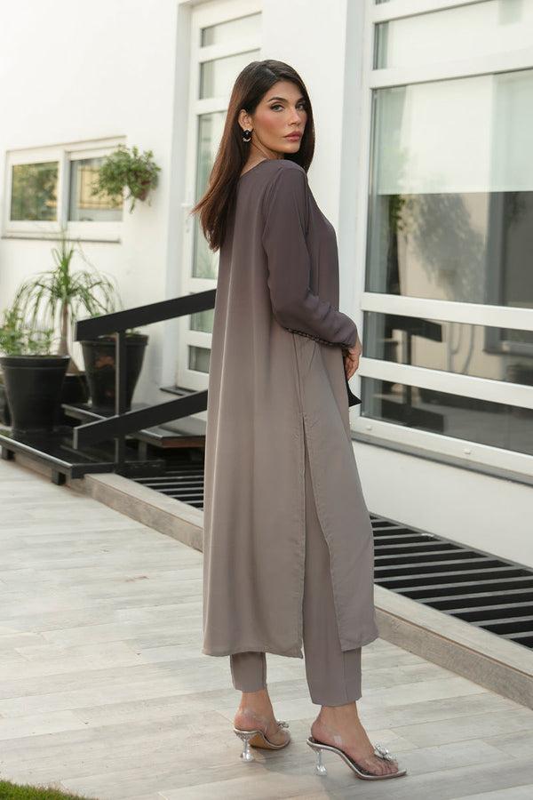 Ashen is a stunning ombré grey georgette suit. Exhibiting a luxurious fall, this suit exudes elegance. It features exquisite button details on the back and sleeves, adding a touch of sophistication to your ensemble. This ensemble comes with straight ombre georgette trousers.