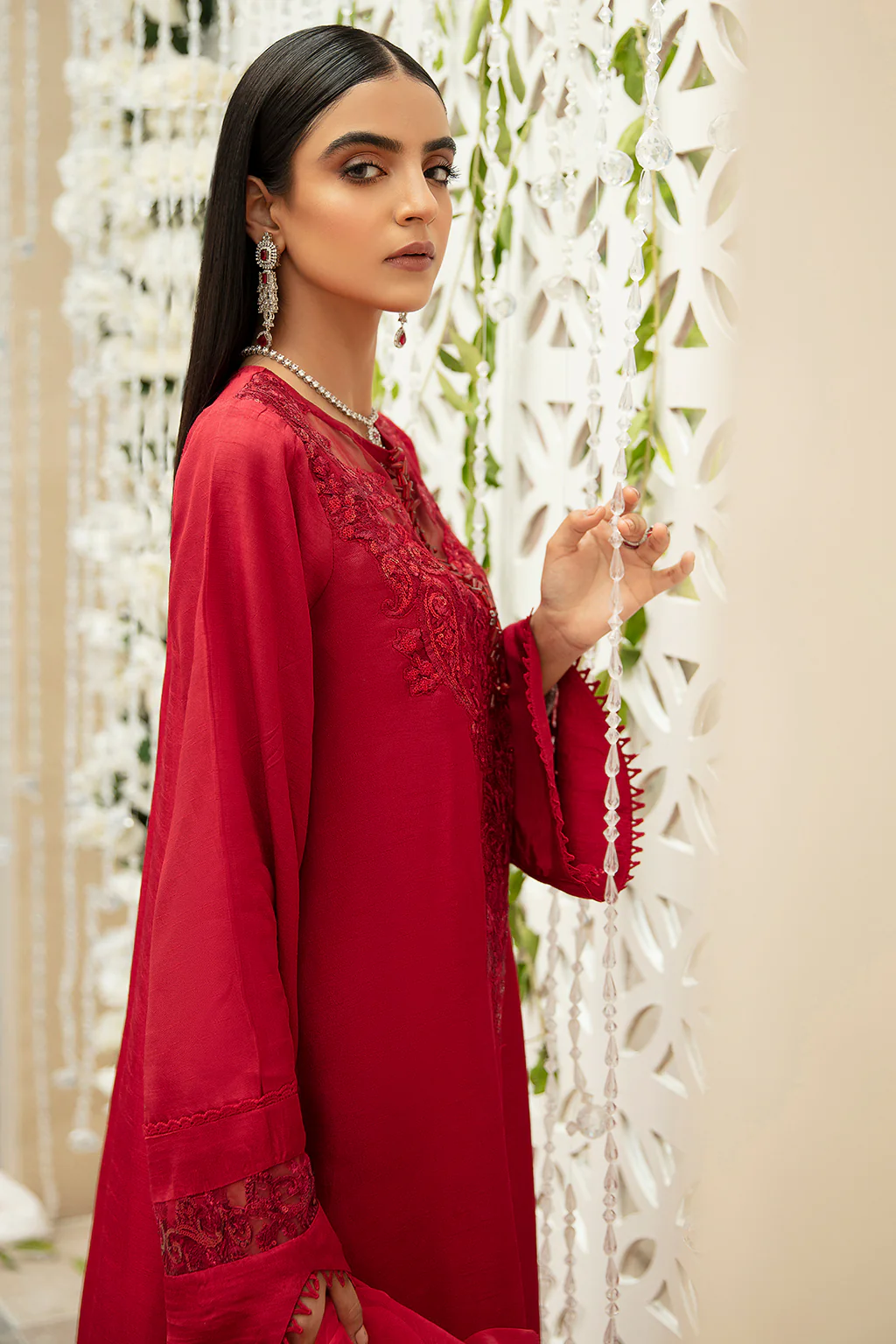 Is a long Korean raw silk shirt with Organza and Lace details having Embroidered and Embellished neckline paired with a ruffled Dupatta and Silk Pants.