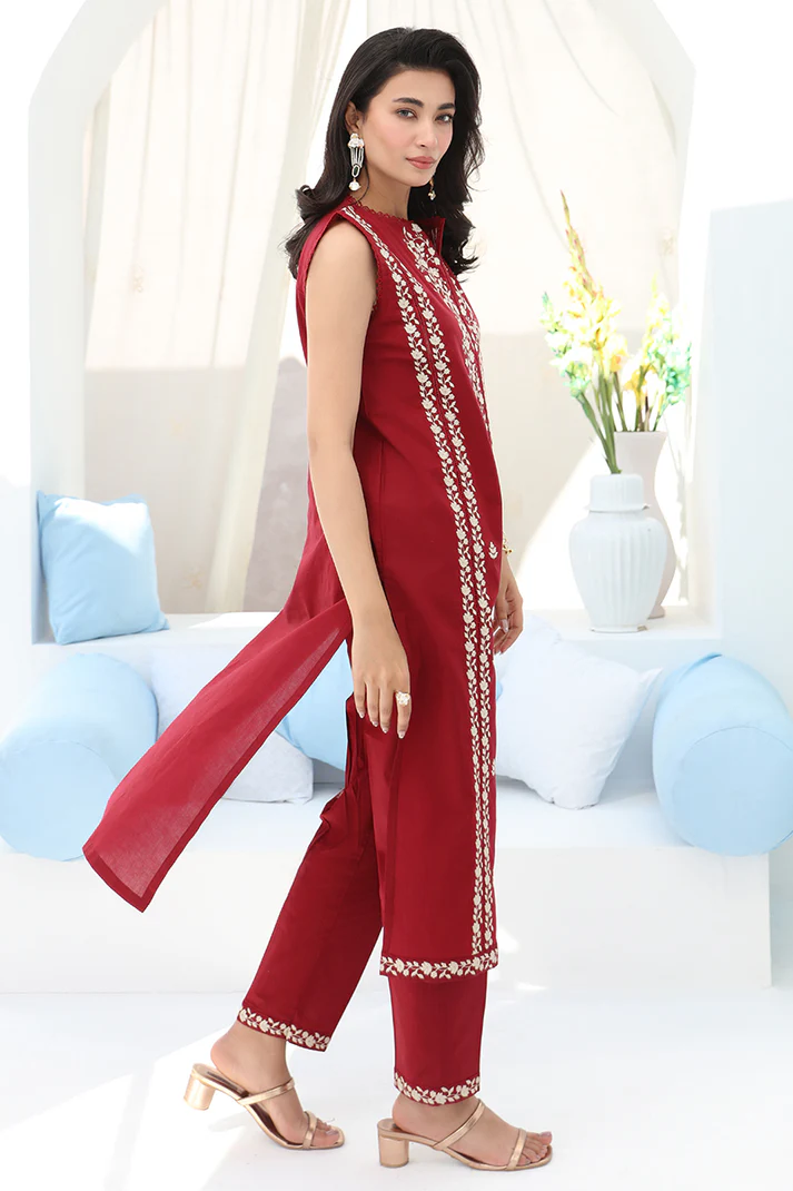 Create a memorable Eid look in our Maroon 2-pc fully embroidered lawn cotton suit with minimal embroidery details on the trousers.