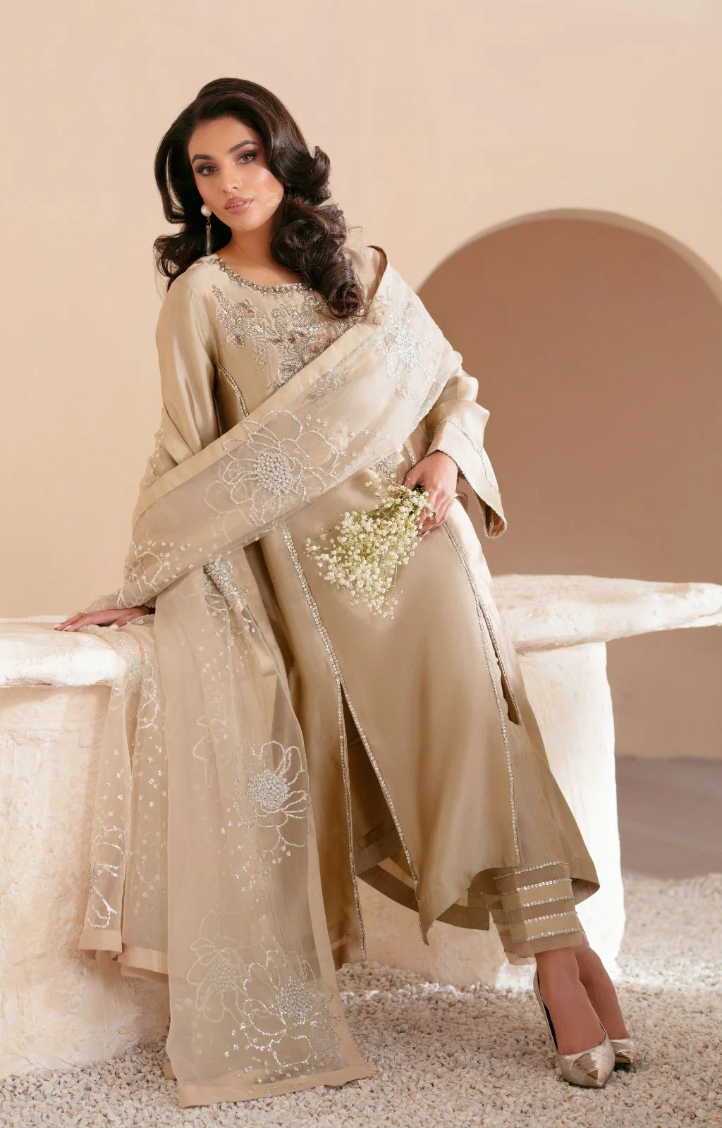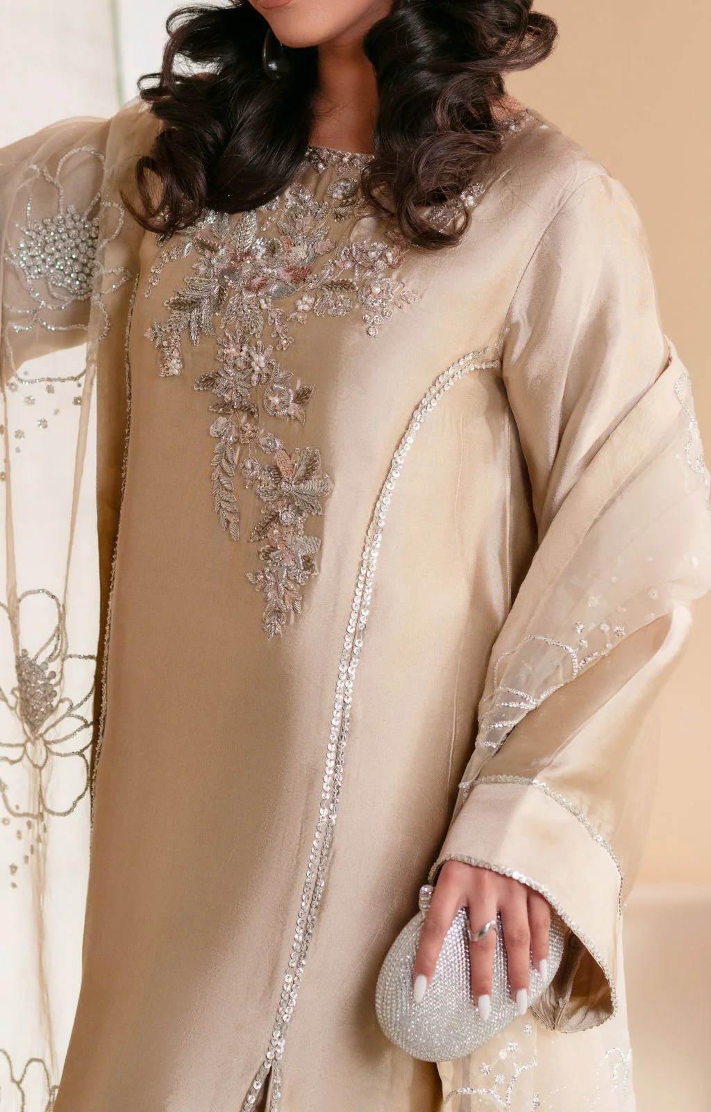 Presenting ‘Cosmic Dust’ – an ethereal masterpiece crafted on luxurious beige gold shesha silk. ✨ This long panelled cut shirt features a hand-embellished neckline and delicate sequin work cascading across the panels. Loose sleeves are finished with shimmering sequin lines. Pants are adorned with sequins and cutdana along elegant organza inserts. Complete the look with an embroidered organza dupatta, featuring celestial sequin bunches. From our Lahore atelier, a true celebration of artistry.