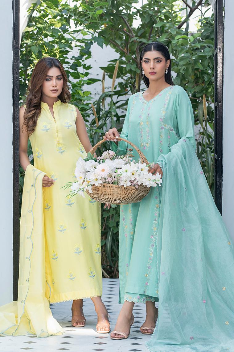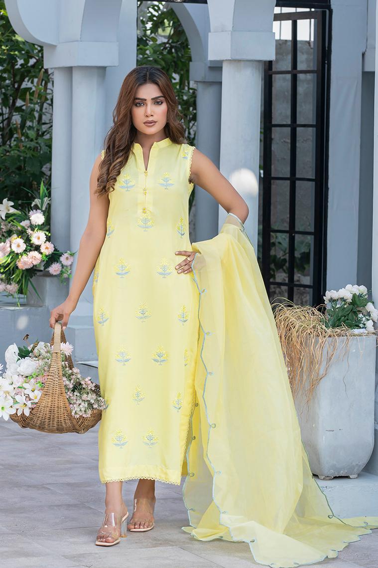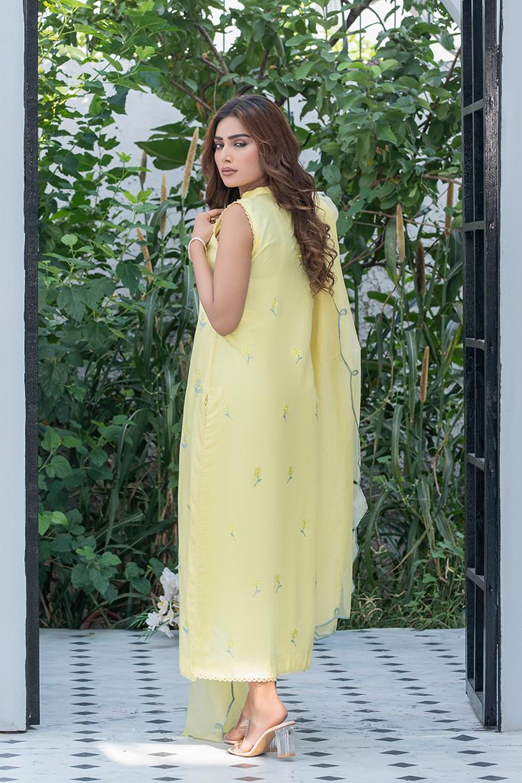 Embrace the warmth of our Golden Sunrise Ensemble, meticulously crafted from luxurious Raw Silk. This enchanting outfit features delicate cutwork on the organza dupatta, beautifully complementing the long shirt, which showcases a soft, buttery hue that evokes the first light of dawn. Accented with light yellow and icy blue embroidery, the ensemble creates a stunning contrast that adds an ethereal touch.
