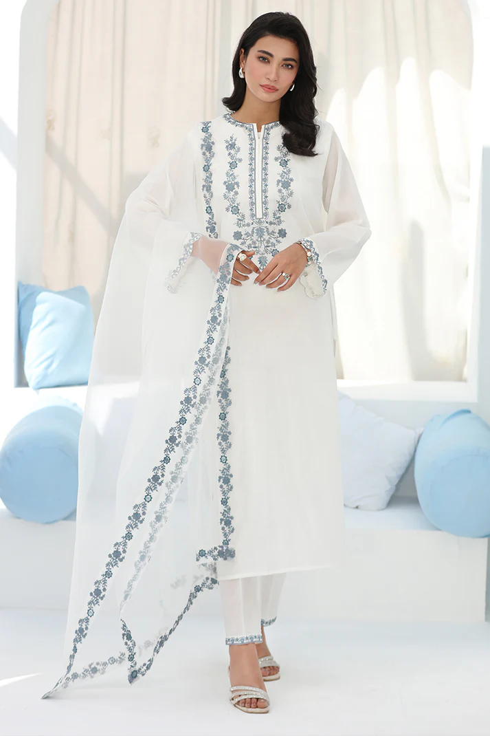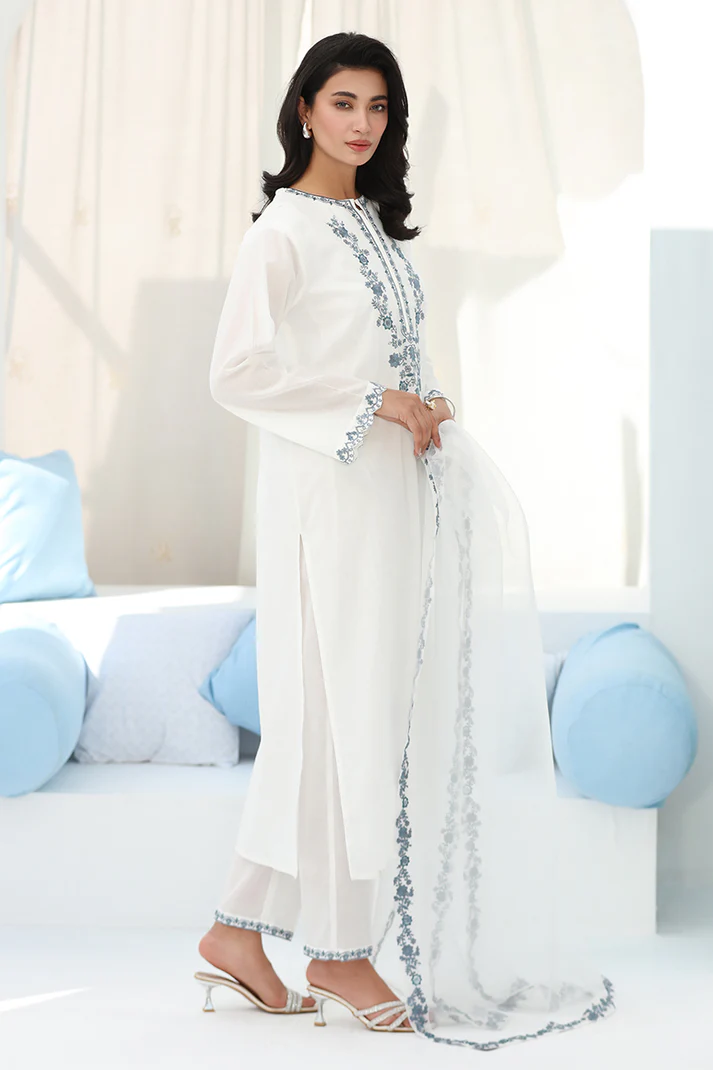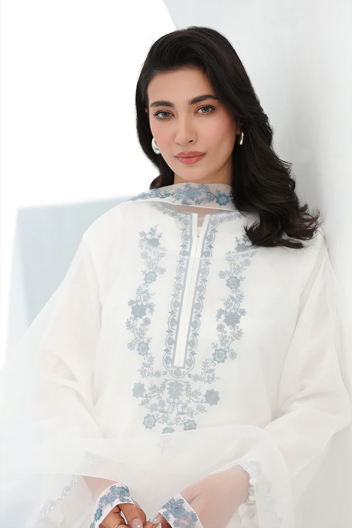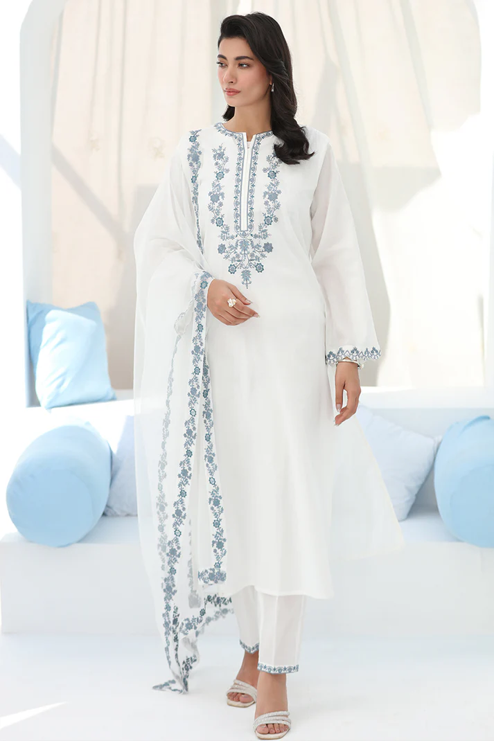 Elevate your style with our gorgeous white 2-pc embroidered lawn cotton suit elevated with beautiful light blue embroidered neckline and delicate embroidery details on the sleeves & trousers.