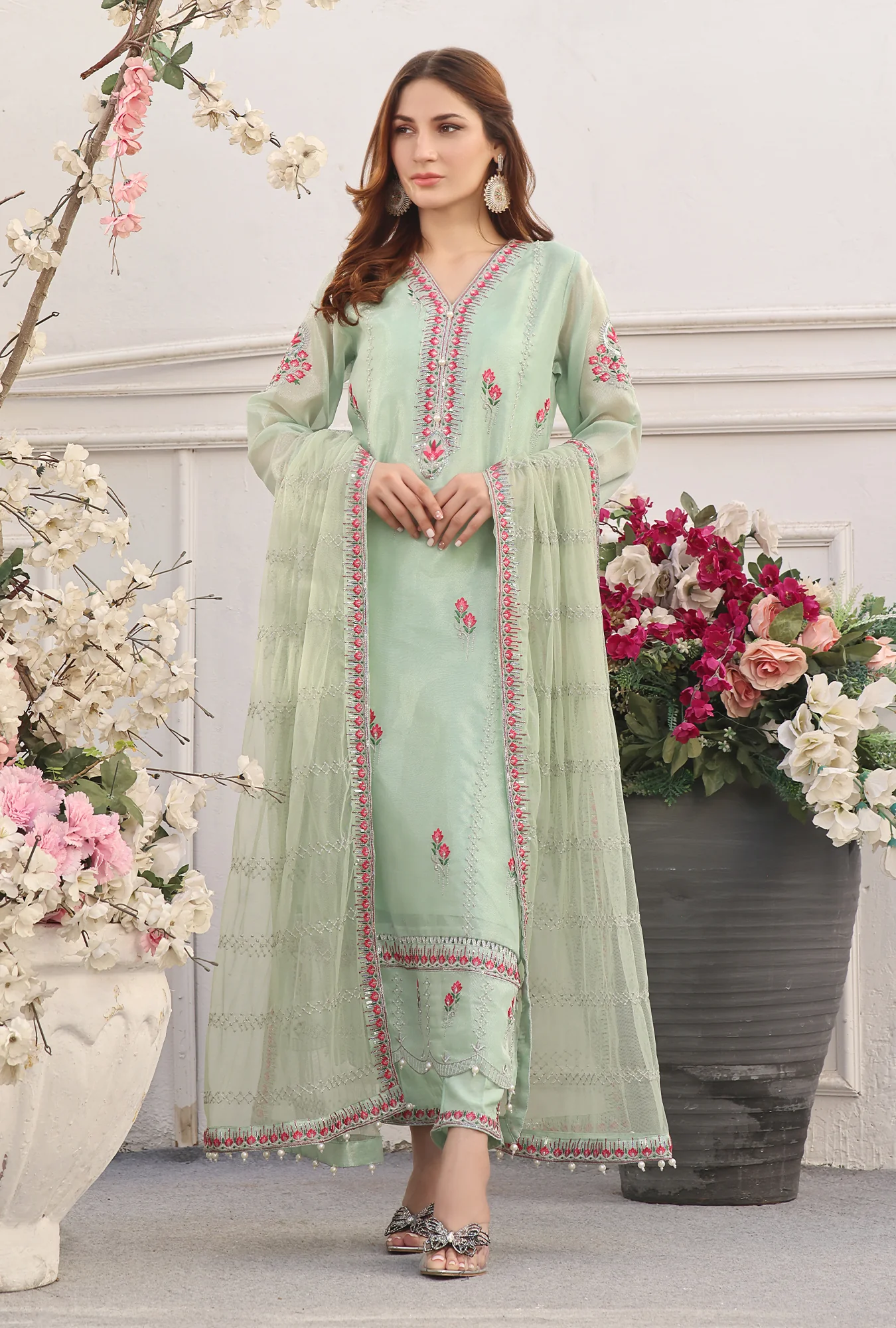 Indulge in understated elegance with this ensemble. Featuring an embroidered neckline and shirt adorned with hand embellishment, this outfit exudes sophistication and charm. The net dupatta adds a touch of shimmer and grace, elevating the design to new heights of elegance. Whether for a formal occasion or a casual gathering, this outfit promises to make a statement with its understated yet captivating allure.