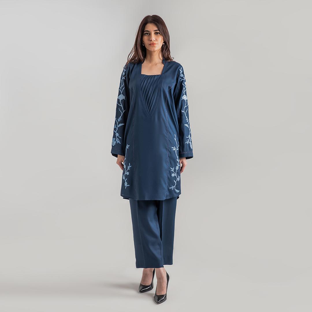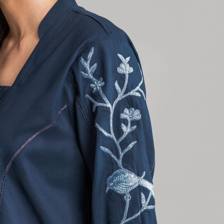 Intricate detail on sleeve and daman highlights this outfit. Short shirt with culotte completes the look.