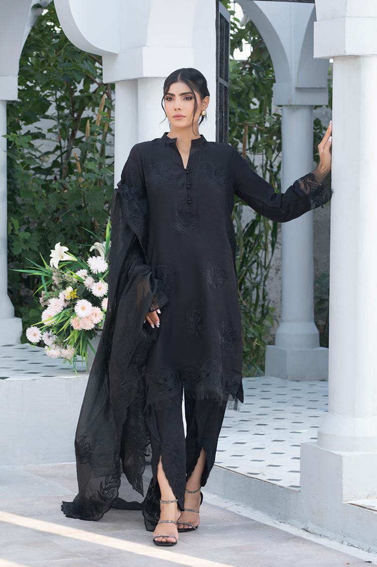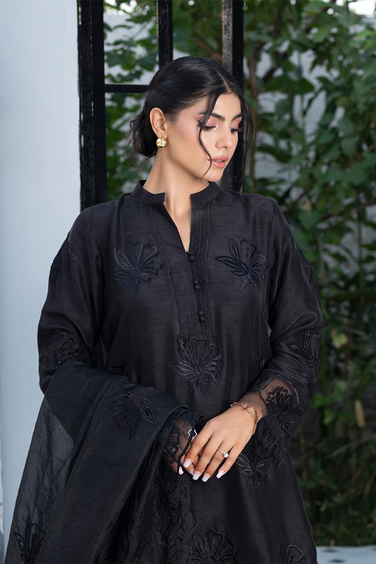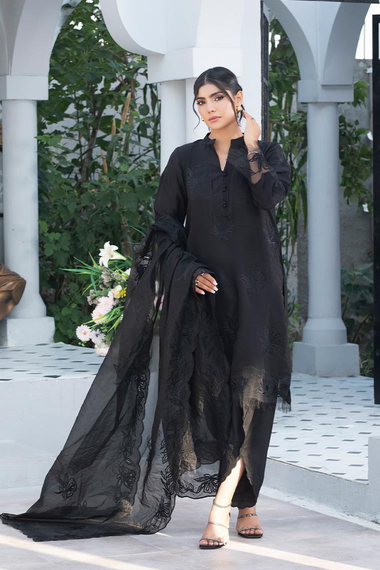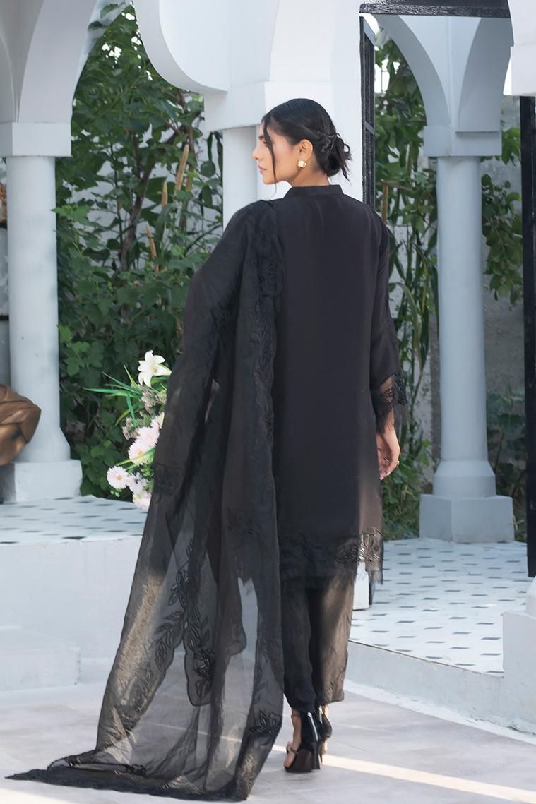 Experience elegance with our Elegant Coal Black Ensemble, meticulously crafted from sumptuous Raw Silk. This stunning outfit features exquisite black embroidery on the shirt, complemented by a chic organza patch that enhances its overall allure with delicate detailing. Paired with fashionable tulip pants, also embellished with matching embroidery, this ensemble is ideal for formal occasions. The look is beautifully completed by an organza dupatta adorned with intricate cutwork, adding a sophisticated flair. Effortlessly elevate your wardrobe with this timeless piece that harmonizes tradition and modern style, making it perfect for celebrations, dinners, and elegant gatherings.
