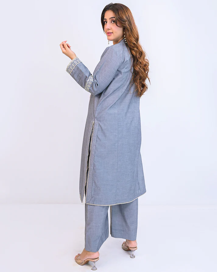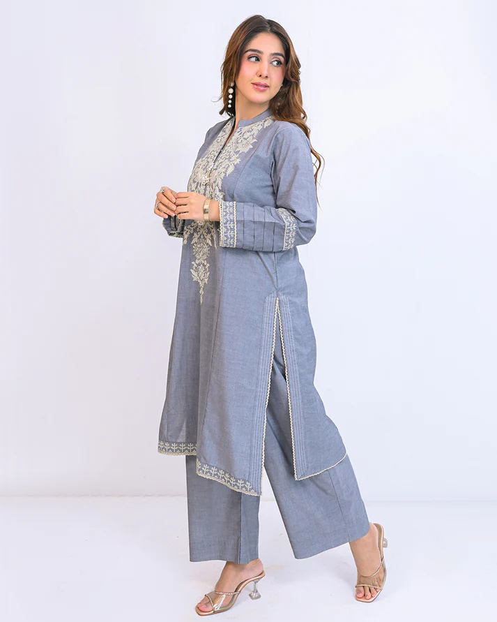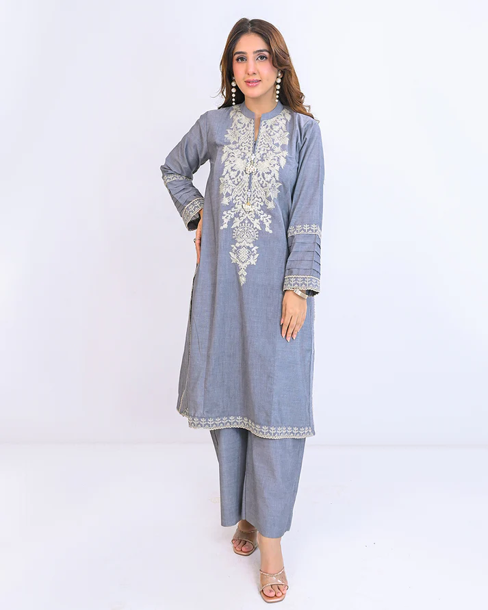 Elegant Chambray grey long kameez with matching Azzar pants, featuring intricate cross-stitch embroidery, pleat details, and handmade pearl tassels.