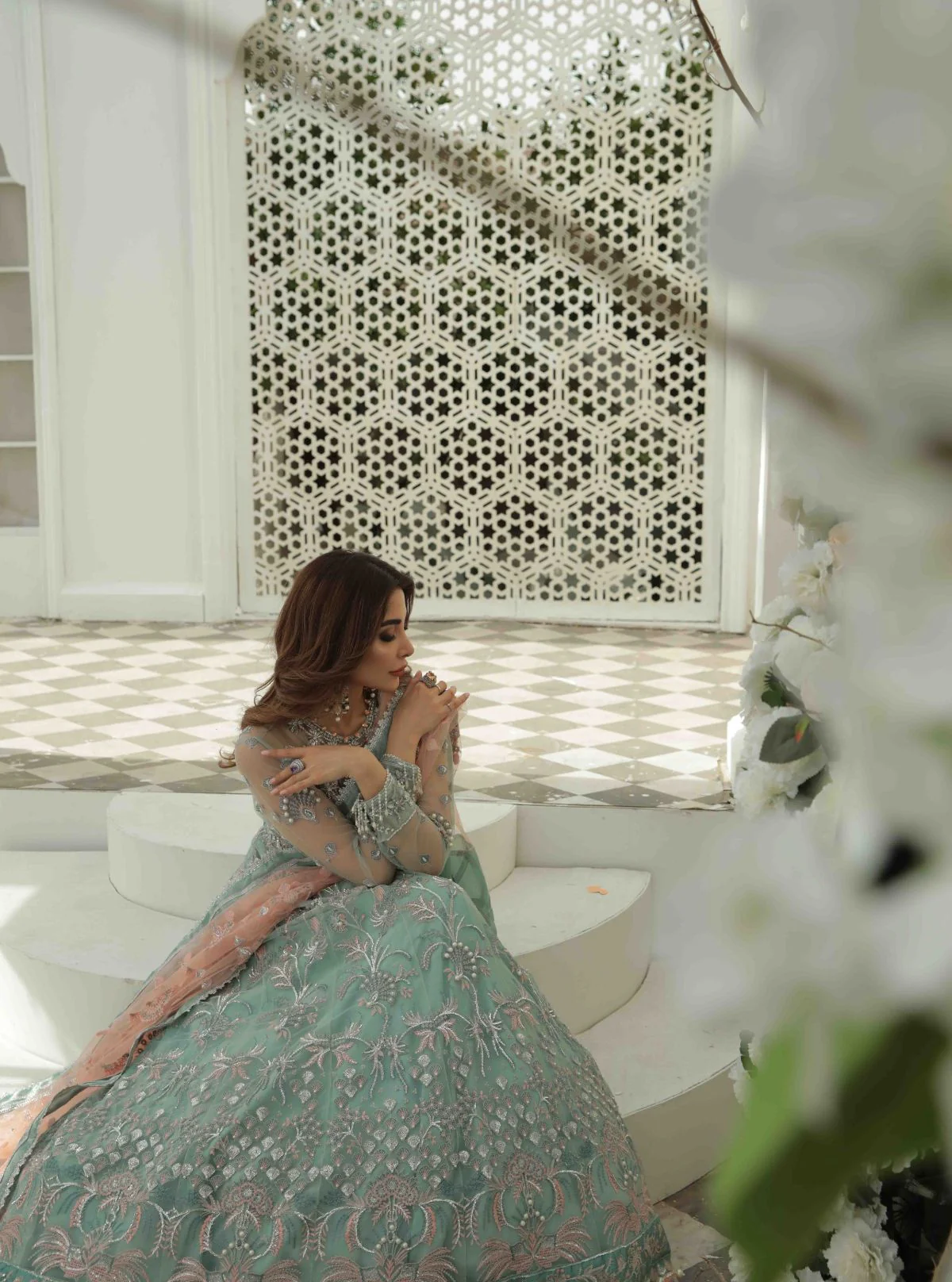 - Embroidered and pearl embellished front 6 panels