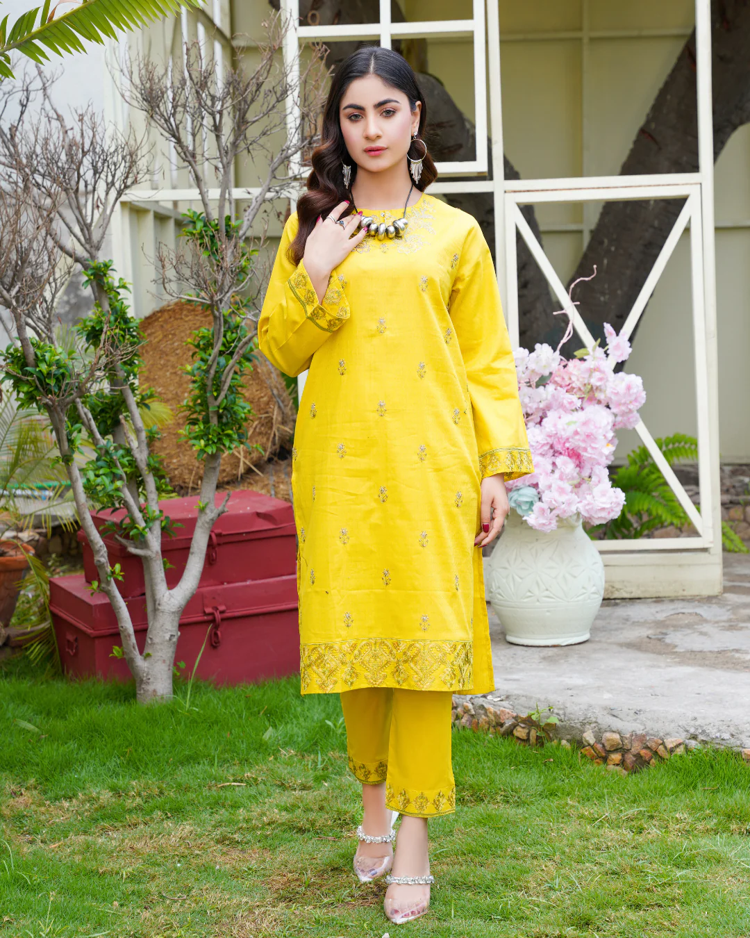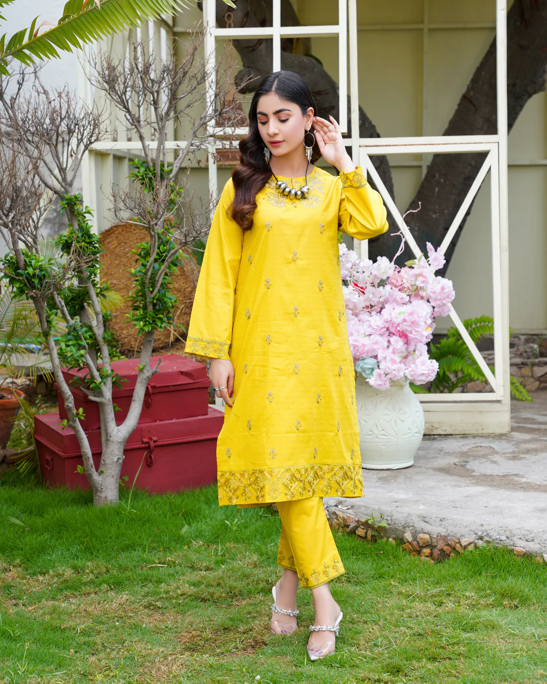 Step into a world of enchantment with our latest creation, the Embroidered Trifecta Ensemble. A harmonious fusion of artistry and elegance, this ensemble features intricate embroidery gracing the shirt, sleeves, and trousers, promising to elevate your style to unparalleled heights.