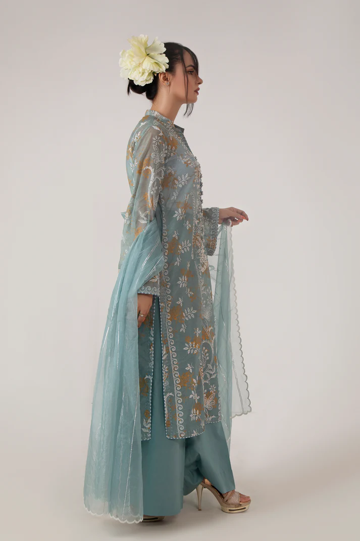 Try the exquisite blue khaddi lawn shirt with gold and white emboss printing, hand-embellished neckline, paired with printed dupatta and cotton trousers for a stylish and elegant look.