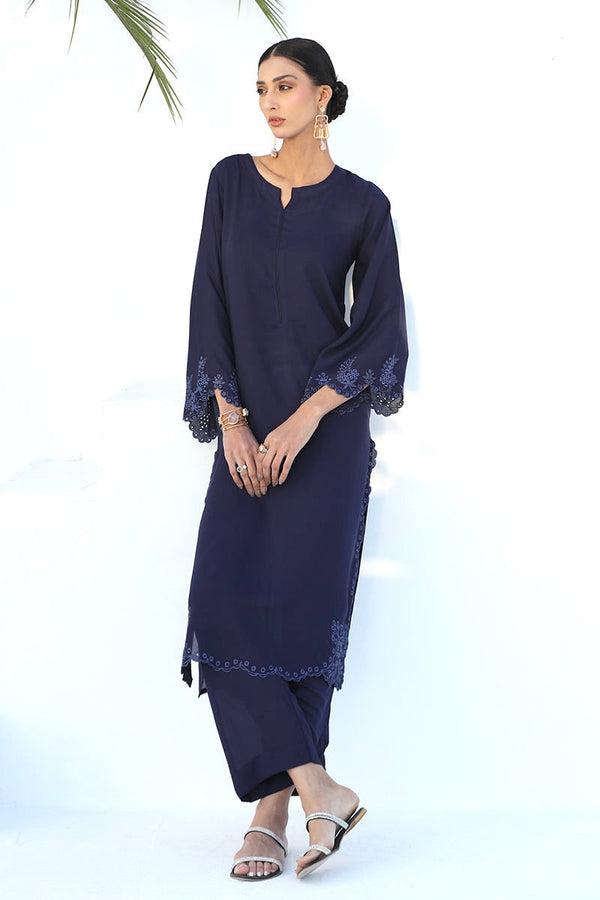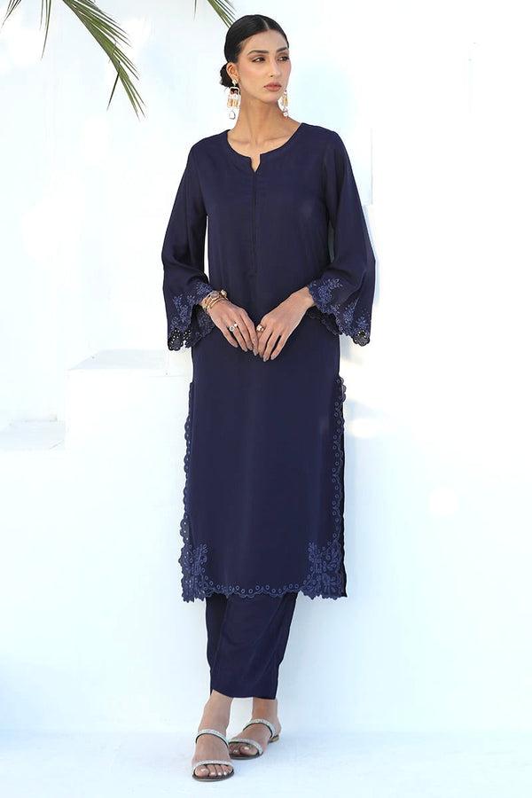 Skyler is a navy blue piece, meticulously adorned with delicate cutwork embroidery on the hem and sleeves. It’s a true testament to exquisite craftsmanship and timeless elegance. The deep navy blue hue exudes sophistication, while the intricate cutwork embroidery adds a touch of refinement.