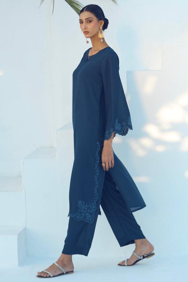 A gorgeous teal blue piece, meticulously adorned with delicate cutwork embroidery on the hem and sleeves. It’s a true testament to exquisite craftsmanship and timeless elegance. The teal blue hue exudes sophistication, while the intricate cutwork embroidery adds a touch of refinement.