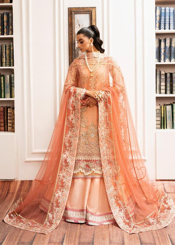 A captivating creation in a soft powder peach organza, adorned with rich dark pink borders. The mid-length silhouette is intricately embroidered with tilla, sequins, and tonal resham threads. Lavishly embellished with Swarovski crystals, pearls, and sequins, every inch of the shirt sparkles with opulence. The ensemble features our signature dupatta, embellished with over 2000 hand-applied Swarovski crystals, creating a mesmerizing shimmer. Paired with elegant dyed raw silk sharara pants, this outfit is the epitome of timeless elegance and modern luxury.